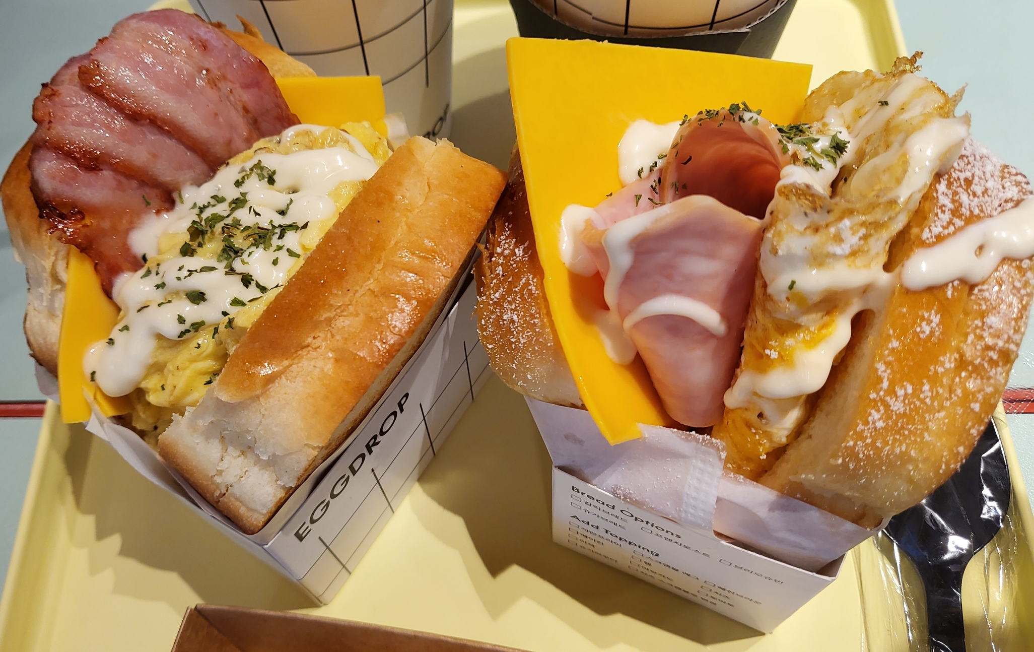 저희가 주문한 메뉴는 베이컨 더블 치즈와 햄 앤 치즈로 주문하였어요.